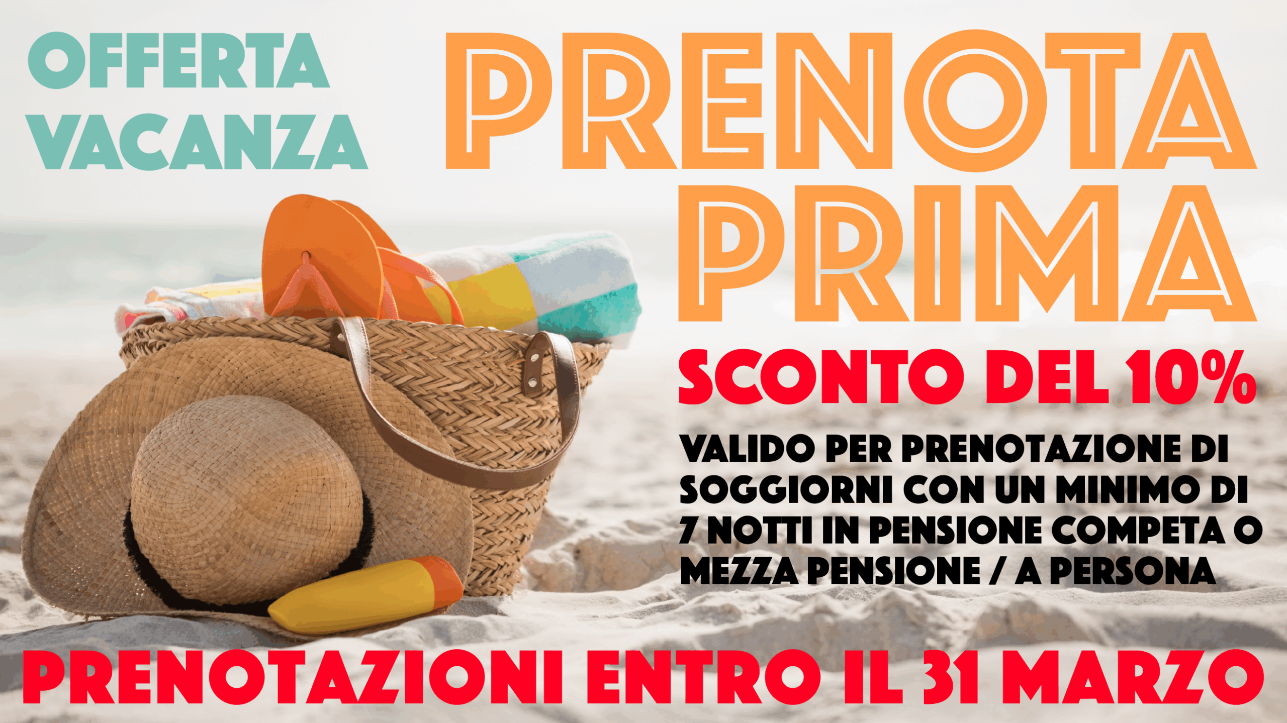 Sconto del 10% per soggiorni di minimo 7 giorni, in trattamento di Pensione Completa o Mezza Pensione, prenotabile entro il 31.03